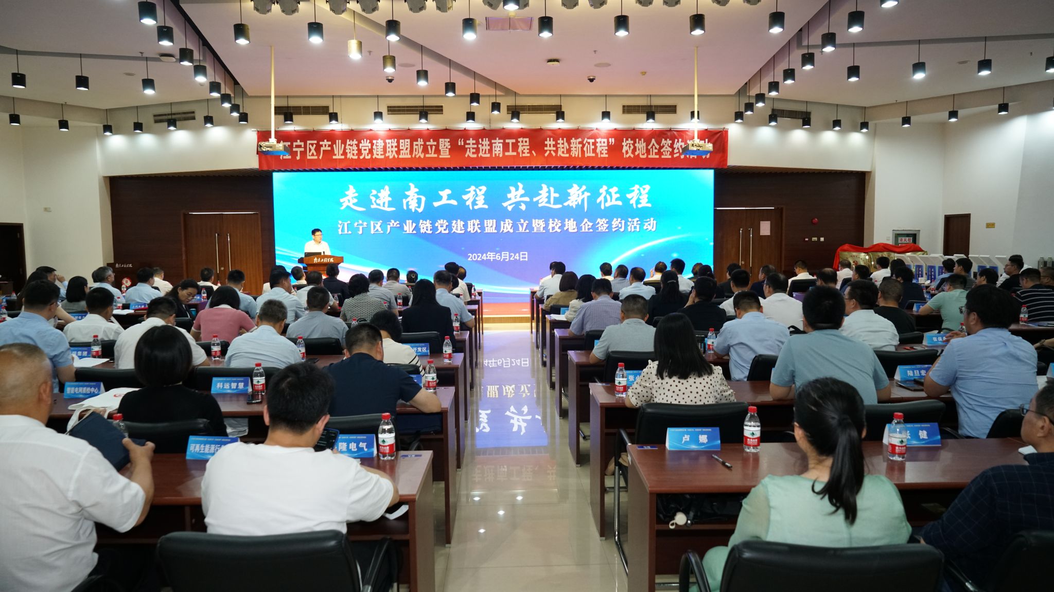 6月24日下午,江宁区产业链党建联盟成立暨“走进南工程、共赴新征程”校地企合作签约活动在我校举行。南京市委常委、江宁区委书记林涛,江宁区委常委、组织部部长任宁,江宁区委常委、副区长、江宁高新区党工委书记王才权,江宁区副区长周强;我校党委书记孙爱武,党委副书记、校长张仰飞等全体校领导班子成员出席会议。活动由党委副书记濮励杰主持。孙爱武代表全校师生员工对出席活动的各级领导、嘉宾以及社会各界朋友表示热烈...