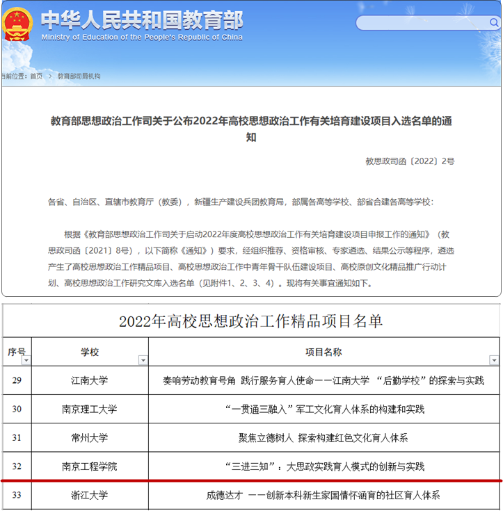 近日,教育部思想政治工作司公布了2022年高校思想政治工作有关培育建设项目入选名单。我校申报的《“三进三知”:大思政实践育人模式的创新与实践》项目成功入选思想政治工作精品项目。这是自教育部2018年启动高校思想政治工作有关培育建设项目以来,我校首次获批该项目,实现了凯发国家级思想政治工作精品项目零的突破,也是我校思想政治教育工作取得的标志性成果。