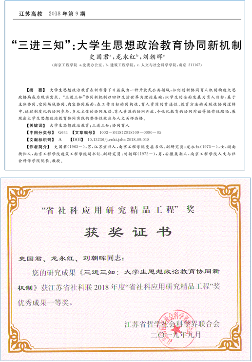 《“三进三知”大思政实践育人模式的创新与实践》项目入选教育部思想政治工作精品项目,成果获评江苏省社科应用研究精品工程奖一等奖,入选江苏地方改革发展典型案例并结集出版。