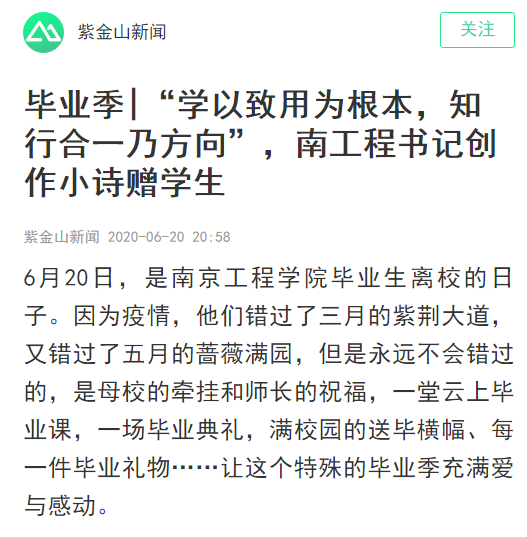 “原来以为毕业典礼也要在云端,如今能听到校长面对面的毕业致辞,我们没有遗憾了!新征程的号角已经吹响,我们将牢记‘学以致用’的校训和‘知行合一,创业创新’的校园精神,让时间作证、用行动证明,以南工程学子独有的姿态,去服务社会,实现自我。”毕业生李志说。