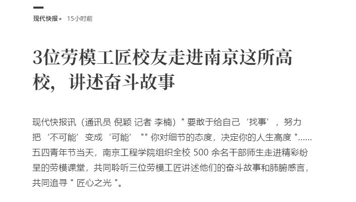 《现代快报》:3位劳模工匠走进南京这所高校,讲述奋斗故事