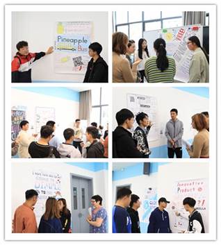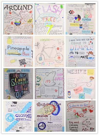 在芬兰籍教师Susan McAnsh和Magda Liontou的指导下,同学们充分发挥自己的想象力,模拟设计出各类新颖,并且功能齐全的应用软件。同学们将本组精心手绘的宣传海报张贴在教室墙壁上,向前来观摩的同学展示其团队的软件设计理念。成果汇报会现场,两个班的同学被分为二十个小组,每组成员依据海报上展示的内容,用英文向在场的老师和同学们分享他们设计的软件特点与用途,并回答对软件的使用、功能、优势、市场需求等方面提出的问题。每一张展示海报旁贴有二维码,现场观摩的同学可以通过扫码在国教院的在线学习平台Moodle中对汇报的小组进行评分。蒋静院长和两位芬兰籍教师全程参与了汇报会,她们在聆听成果汇报的同时,也与大家积极交流互动,让同学们在汇报交流的过程中收获更多的知识。